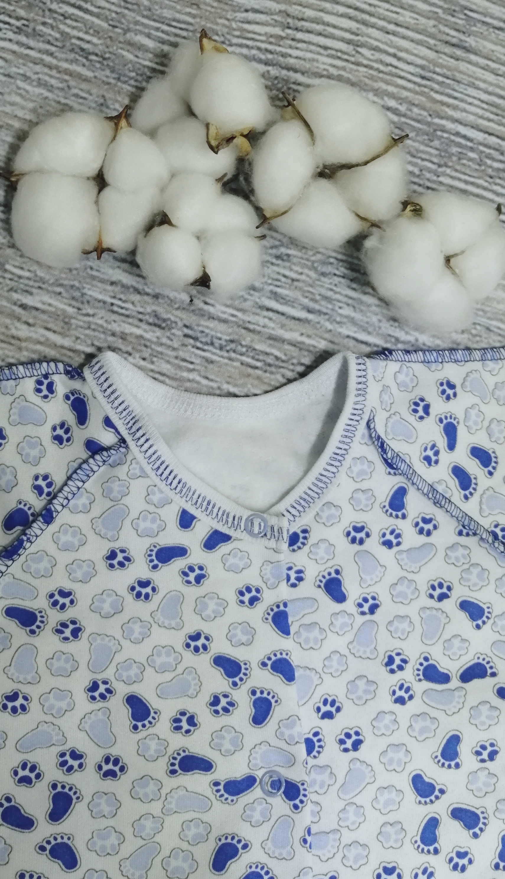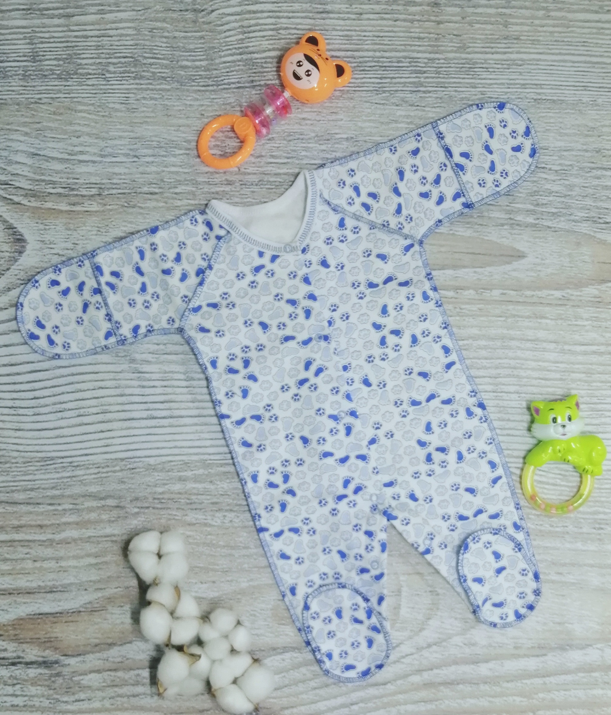 Комбинезон выполнен из 100% хлопка (футер с начёсом). Комбинезон с закрытыми ножками, без воротничка, рукавчики-трансформеры. Комбинезон спереди и между ножек на кнопочках. Швы выполнены наружу.