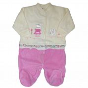 Комбинезон из флиса без воротничка, с закрытыми ножками, с длинными рукавами на манжете, спереди и между ножек на кнопочках, спереди украшен аппликацией и вышивкой.