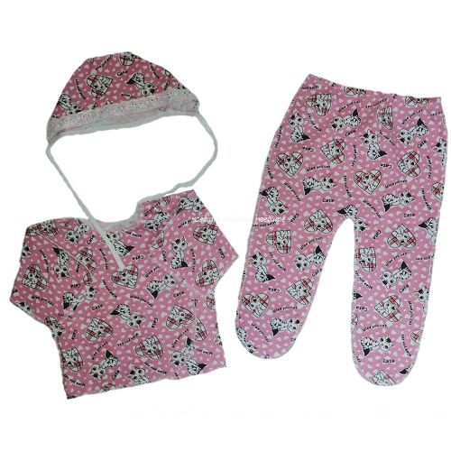 Комплект состоит из распашонки с рукавчиками трансформерами и с кнопочкой на одной стороне, ползунков на резинке, чепчика. Все швы у набора выполнены наружу. Расцветки в каждой партии отличаются.