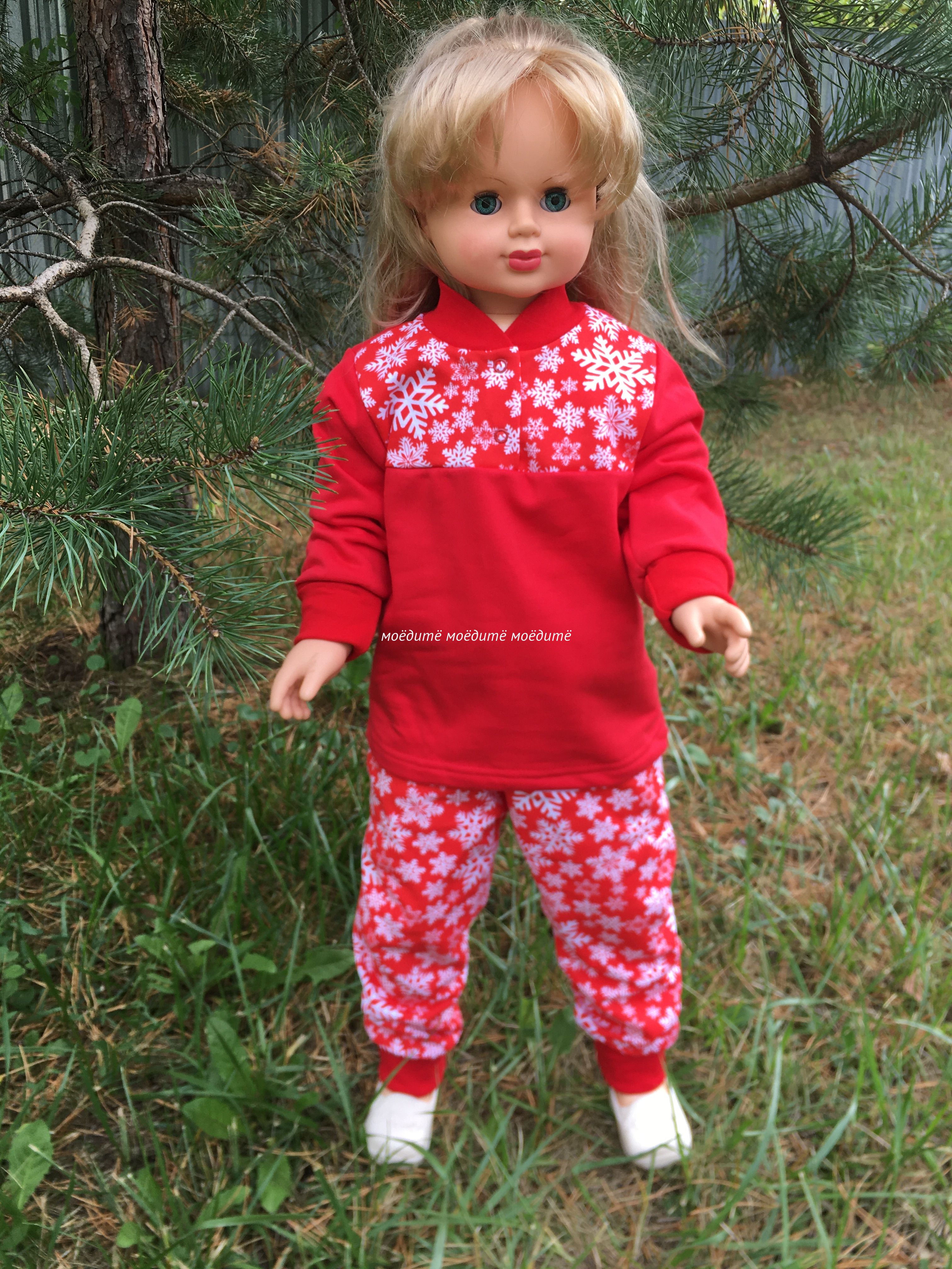 Костюм изготовлен из набивного футера с начёсом. Джемпер прямого кроя на кокетке, с воротничком, с длинным рукавом на манжете с отворотом. Брючки на широкой резинке, снизу на манжете с отворотом.