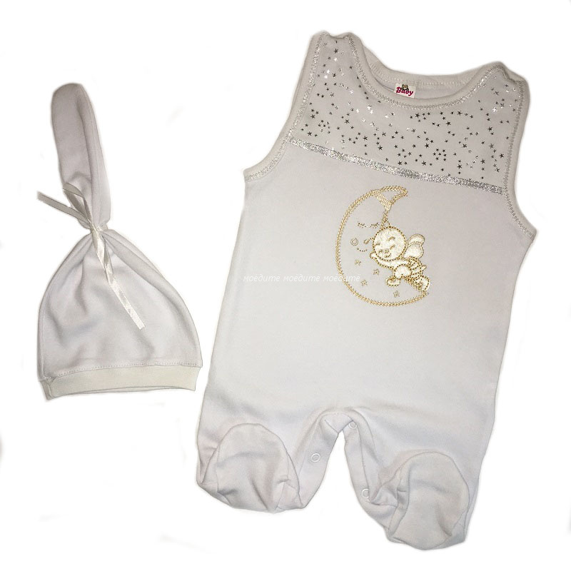 Комплект выполнен из 100% хлопка (интерлок). Комплект на девочку состоит из полукомбинезона с кнопочками на плечиках и между ножек, с закрытыми ножками, спереди украшен вышивкой и шапочки-капельки без завязок.