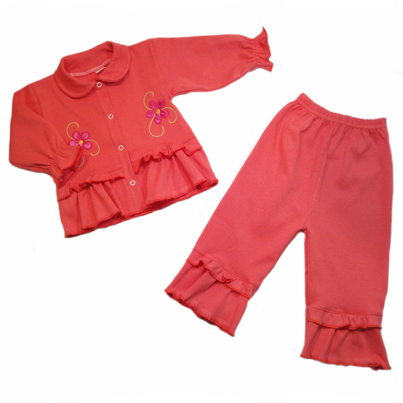 Костюм состоит из кофточки с воротничком, с длинным рукавом на конце на резиночке, спереди на кнопочках, украшена вышивкой на обеих полочках, снизу с рюшкой,  и штанишек на резинке, снизу украшены рюшкой.